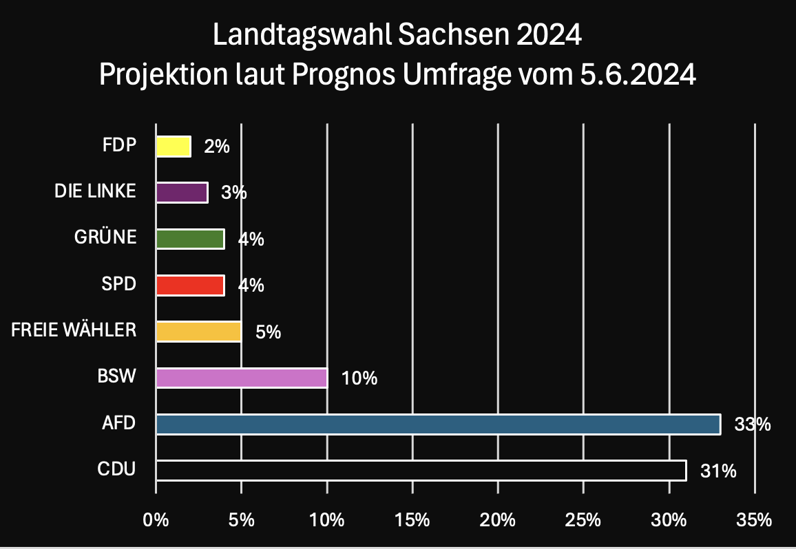 Bereits am 5. Juni 2024 hat das Meinungsforschungsinstituts PROGNOS UMFRAGE in seiner Projektion für die Landtagswahl am 1.9.2024 sehr genau die Zahlen ermittelt, denen sich INSA nun auch nähert.